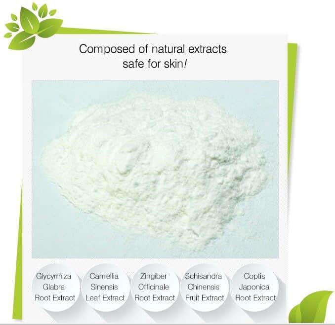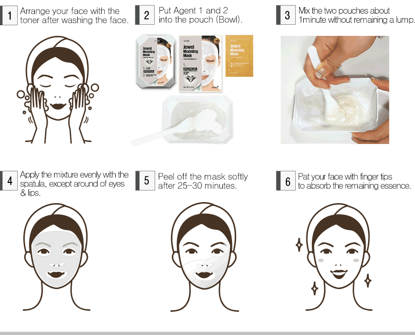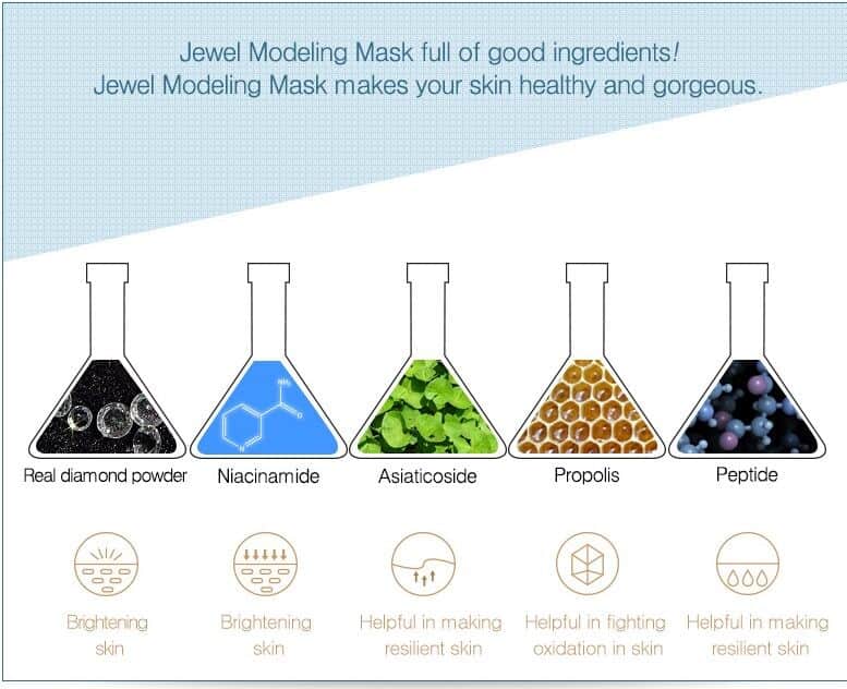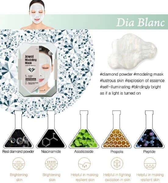 אבקת יהלומים טהורה – ידועה בסגולותיה הממריצות ומחדשות את תאי העור. האבקה משמשת כמוליך למרכיביה הנוספים של המסכה ומאפשרת למסכה לסייע לשיפור גמישות העור.