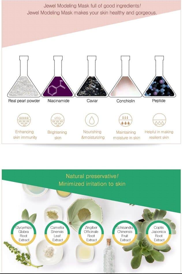 אבקת פנינים טהורה – מכילה חומצות אמינו עשירות, ויטמין B, סידן, אבץ וברזל. לאבקת הפנינים יש תכונות המסייעות להאצת קצב התחדשות התאים, שמירה על לחות גבוהה בשכבת העור העליונה והבהרת העור.